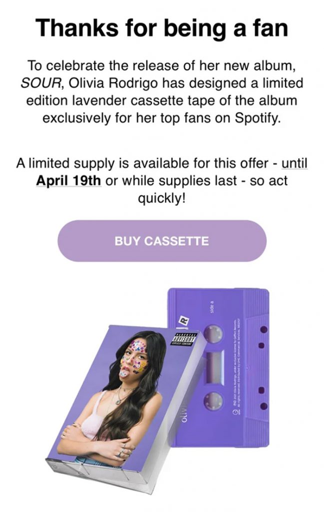 อยากจะขายเทปคาสเส็ตต้องทำอย่างไรดี? ทางแบรนด์ส่งอีเมลขอบคุณแฟนคลับพร้อมพูดถึงเทปคาสเส็ตสีลาเวนเดอร์ Limited Edition ที่จัดทำมาเป็นพิเศษสำหรับแฟนคลับของ Olivia Rodrigo ศิลปินที่มีผู้ฟังมากในระดับท็อปๆ ของ Spotify กลยุทธ์ของ Spotify ในการทำอีเมลแคมเปญนี้คือจับกลุ่มเป้าหมายหลักที่เป็นสาวกศิลปินเป็นอันดับแรก แล้วจั่วหัวอีเมลว่าคุณมีโอกาสซื้อเทปคาสเส็ตของ Olivia Rodrigo อัลบั้มนี้นะ!